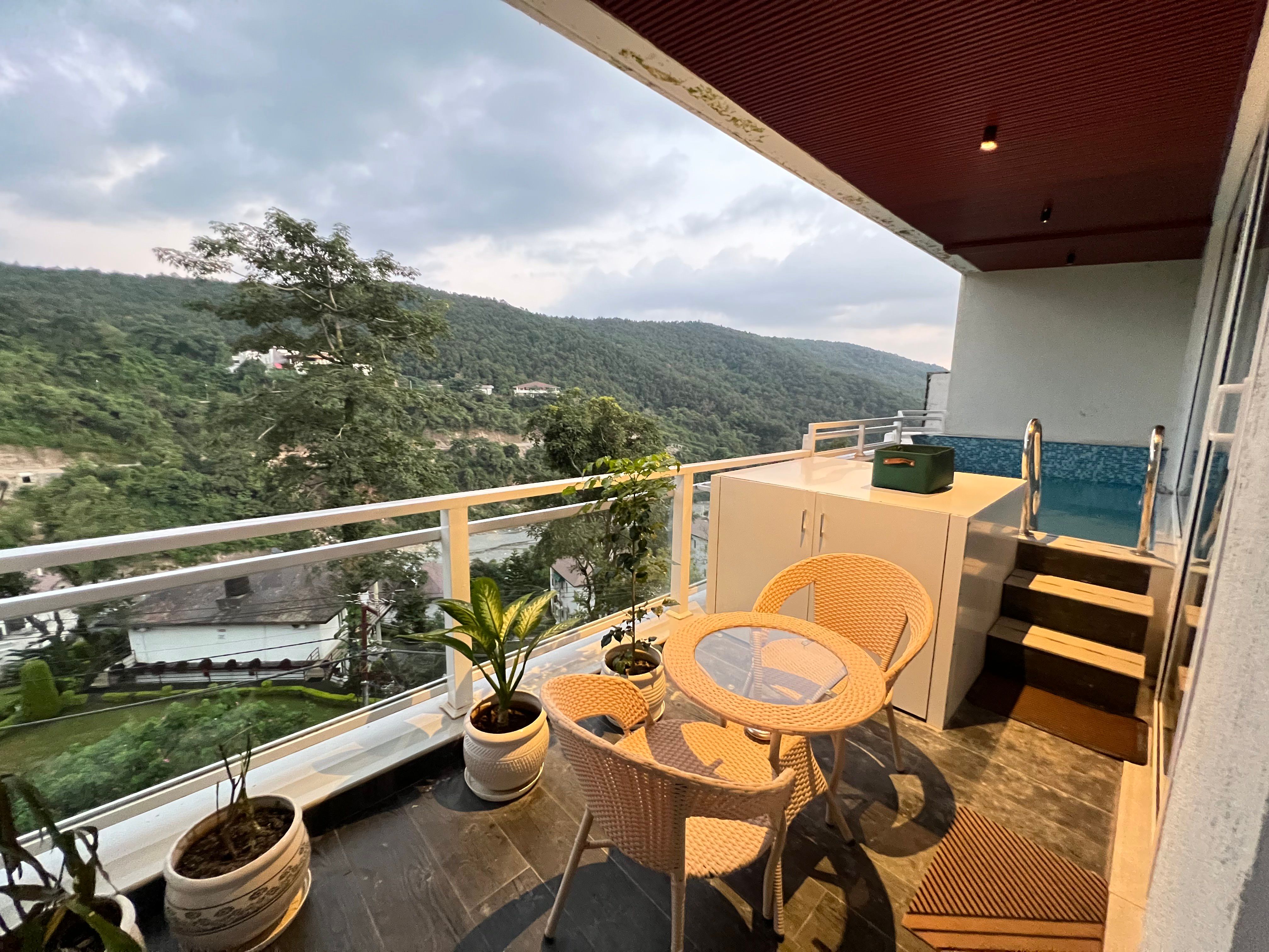 The lounge area stands out with a mustard yellow L-shaped sofa, rustic cane chairs, and a round coffee table. Floor-to-ceiling glass doors flood the space with natural light and open onto a balcony featuring seating and a private jacuzzi with sweeping hill views.