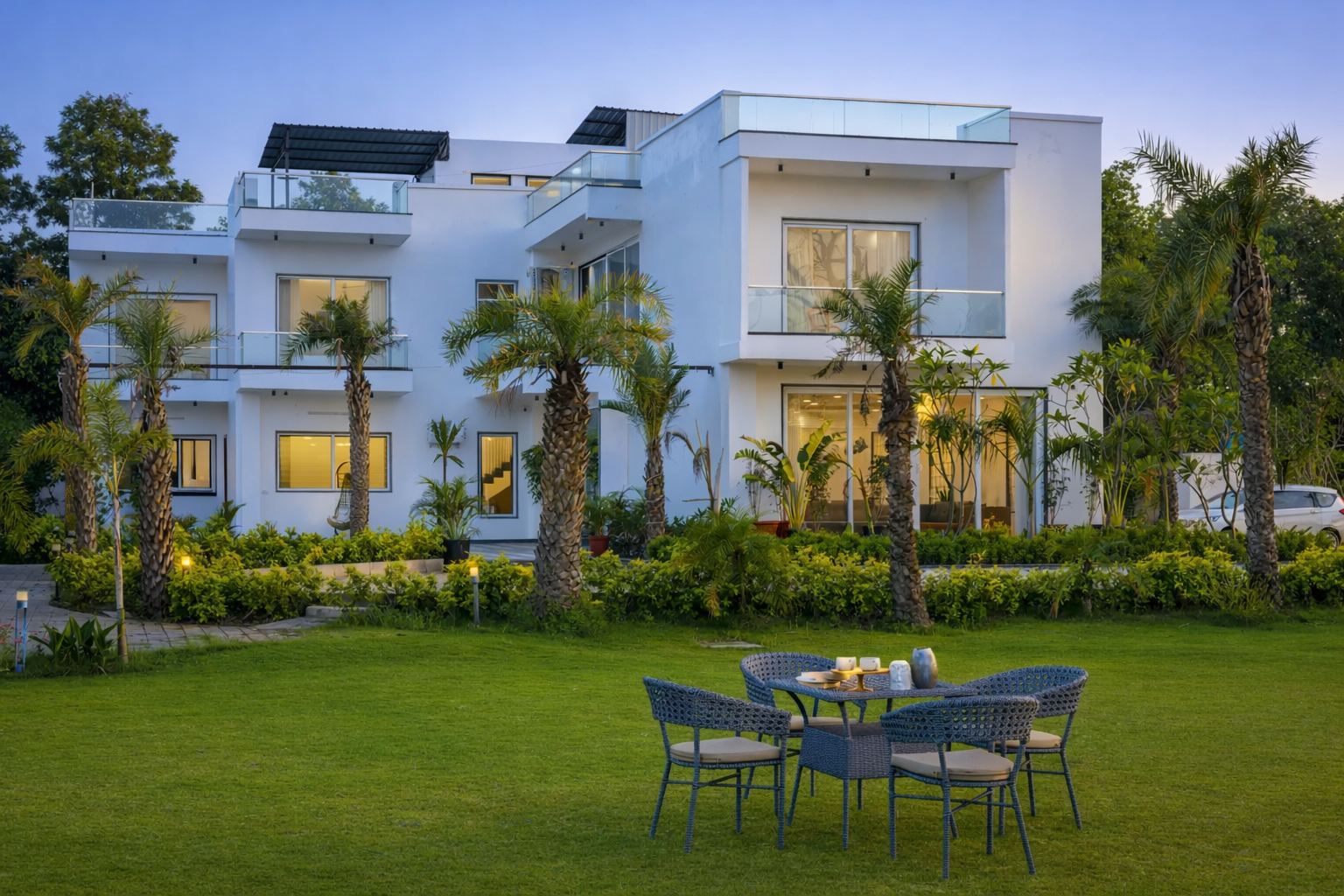 The sparkling pool, framed by open skies & swaying trees, sets the rhythm of this tranquil 5-BHK farmhouse, where every moment flows at its own unhurried pace. Spread across an acre of lush greenery, the villa balances elegance with ease. The private swimming pool is the crown jewel, shimmering under the sky—a tranquil oasis where time slows & the world fades away. Mornings begin with a quiet dip in its cool embrace, afternoons stretch lazily on sun-kissed loungers, & evenings turn magical as the water glows beneath a starlit sky.