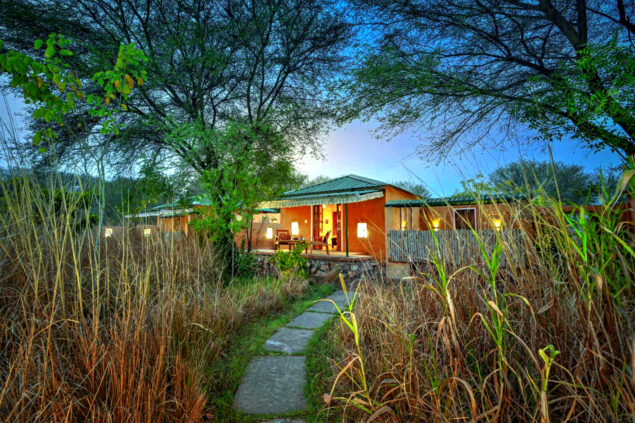 At the far edge of the resort, where the forest grows thicker & the breeze feels a little wilder, this pet-friendly cottage offers its own quiet corner of calm. Earth-toned walls, tiger-striped accents, & soft lighting create a space that soothes from the very first glance. Framed by neem trees & golden grass, it opens into a world that’s both grounded and soulful, where the lines between indoors & nature gently blur.
