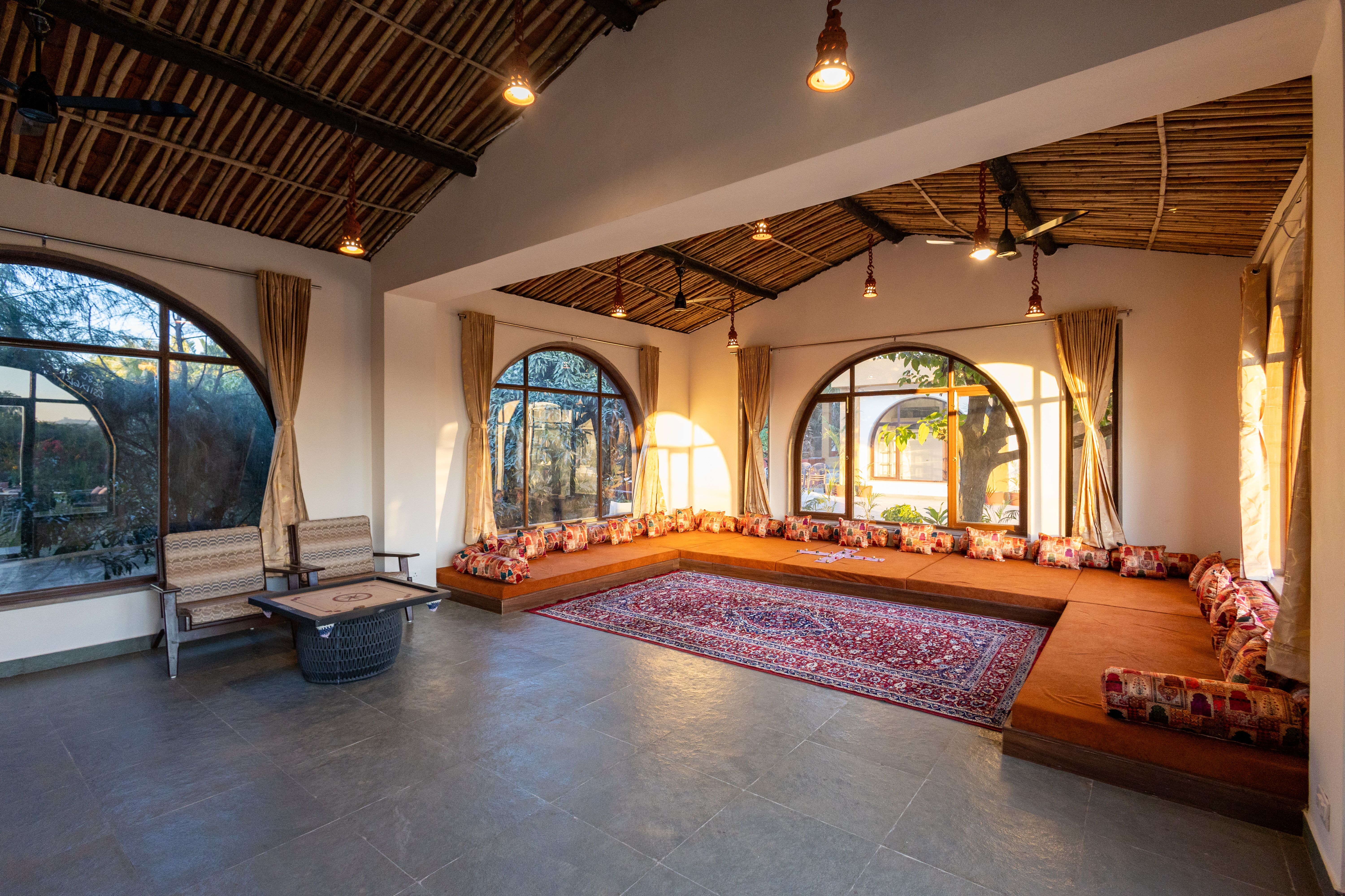 Sunlit lounge with arched windows | Low-seating floor arrangement with plush cushions | Cosy rug-lined seating for board games | Rustic bamboo-style ceiling with warm pendant lights | Calm, open layout for group activities