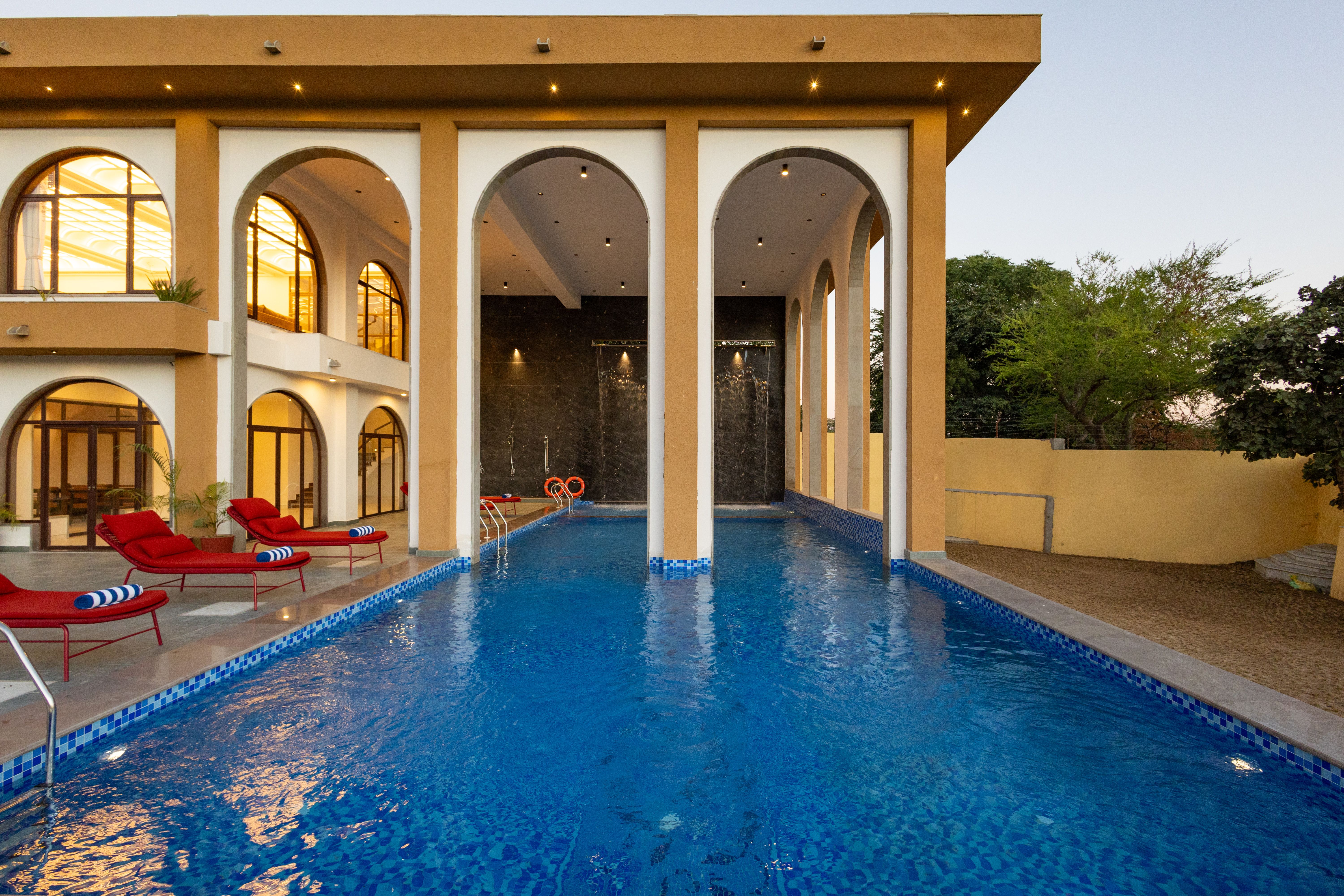 Elegant architectural design | Area: 1500 sq.ft | Depth: 4.5 ft | Multiple cosy loungers | Arched architectural pillars framing the pool | Adjacent green lawn | Attached kids’ pool | Relaxation-friendly space | Ample natural light | Well-maintained & peaceful ambiance